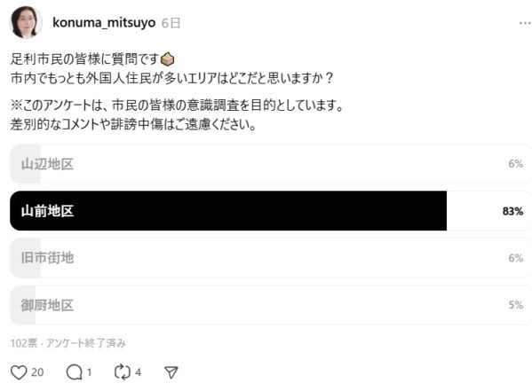 地区により外国人が多い所とそうでないところの差が激しいので、足利市民の意識も違うのかと思い、アンケートを実施しました。