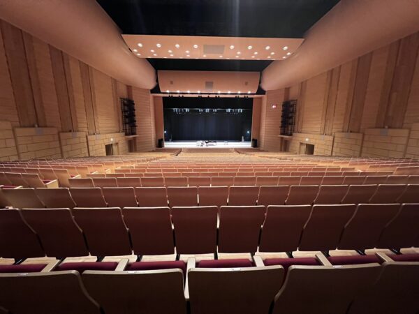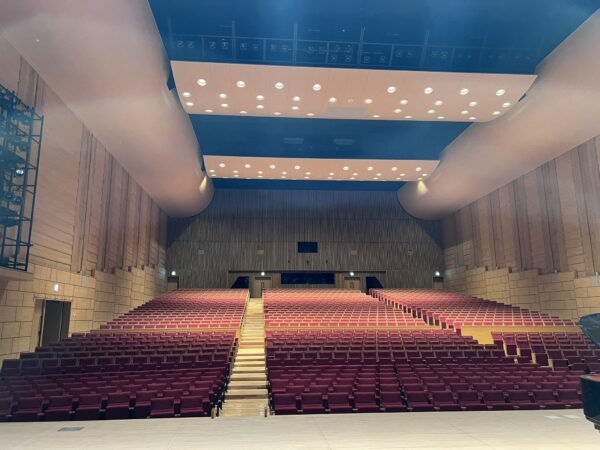 客席は2階席やバルコニー席を設けず、1階から緩やかなスロープ状に後方へ広がる構成となっている。このような構造は音響設計を行う上で残響のコントロールがしやすい利点があるとされている。音響について説明を受けたところ、残響時間は約1.7秒程度であり、クラシック専用というよりも、多様な公演を受け入れる多目的ホールとして設計されていると考えられる。また、可動プロセニアムや音響反射板を用いることで、コンサート形式の公演にも対応できる設計となっている。