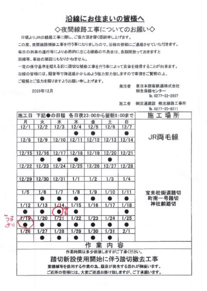JR両毛線 宝来社街道踏切・町南一号踏切・神社前踏切について、夜間工事のお知らせです。